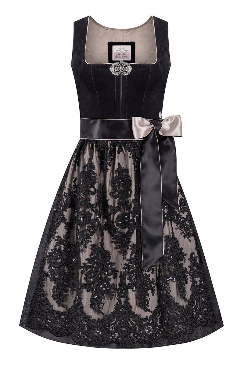 Das Midi Dirndl Greta ist mehr als nur ein Kleidungsstück – es ist ein Statement. Das schwarze Mieder aus feinstem Samt schmiegt sich sanft an Ihre Figur und sorgt für eine wunderschöne Silhouette. Die aufwendigen Verzierungen und die edlen Knöpfe verleihen dem Mieder eine luxuriöse Note. Der taupefarbene Rock bildet einen harmonischen Kontrast und unterstreicht die feminine Ausstrahlung des Dirndls.